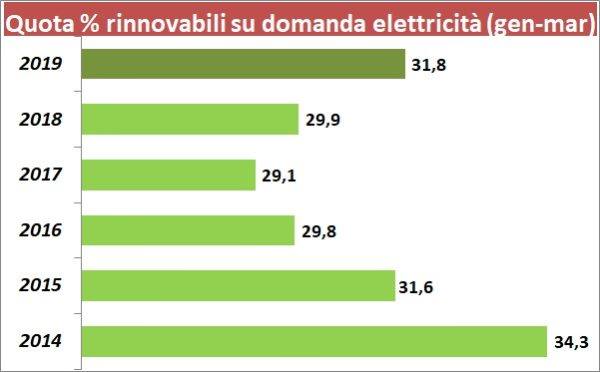 Le strategie energetiche e di sviluppo delle rinnovabili con i governi Letta, Renzi, Gentiloni (maggio 2013 - marzo 2018) con l’apporto penoso dell’ex ministro Calenda, sono state un vero disastro. Abbiamo praticamente perso quasi 5 anni ( fig 4) ma la piccola svolta fino ad oggi visibile del governo Conte, positiva malgrado il crollo dell’idroelettrico a causa della siccità, non segnala grandi novità: Siamo risaliti a circa il 33% di rinnovabili ma senza i 5 anni persi potremmo essere al 50%. Il Piano nazionale integrato Energia e Clima che dovrebbe essere definito per fine anno (se il governo ci arriverà) non è all’altezza della crisi ma per il momento soltanto Greenpeace e pochi altri portano all’attenzione l’importanza dell’appuntamento.